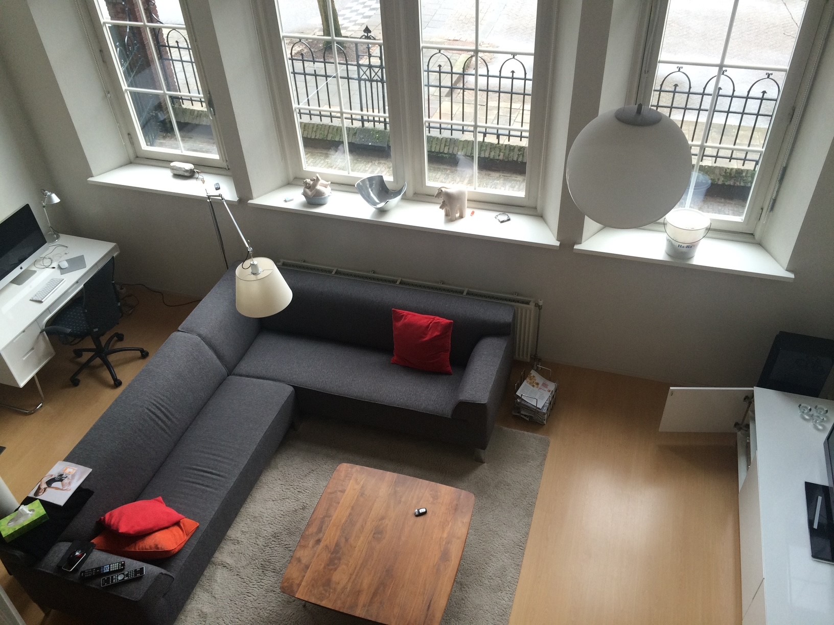 The living room is a real eye-catcher with high ceilings and lots of natural light through the tall windows. The open kitchen is equipped with a gas hob with extractor, dishwasher, refrigerator/freezer, spacious countertop with sink, and more than enough cupboard space.