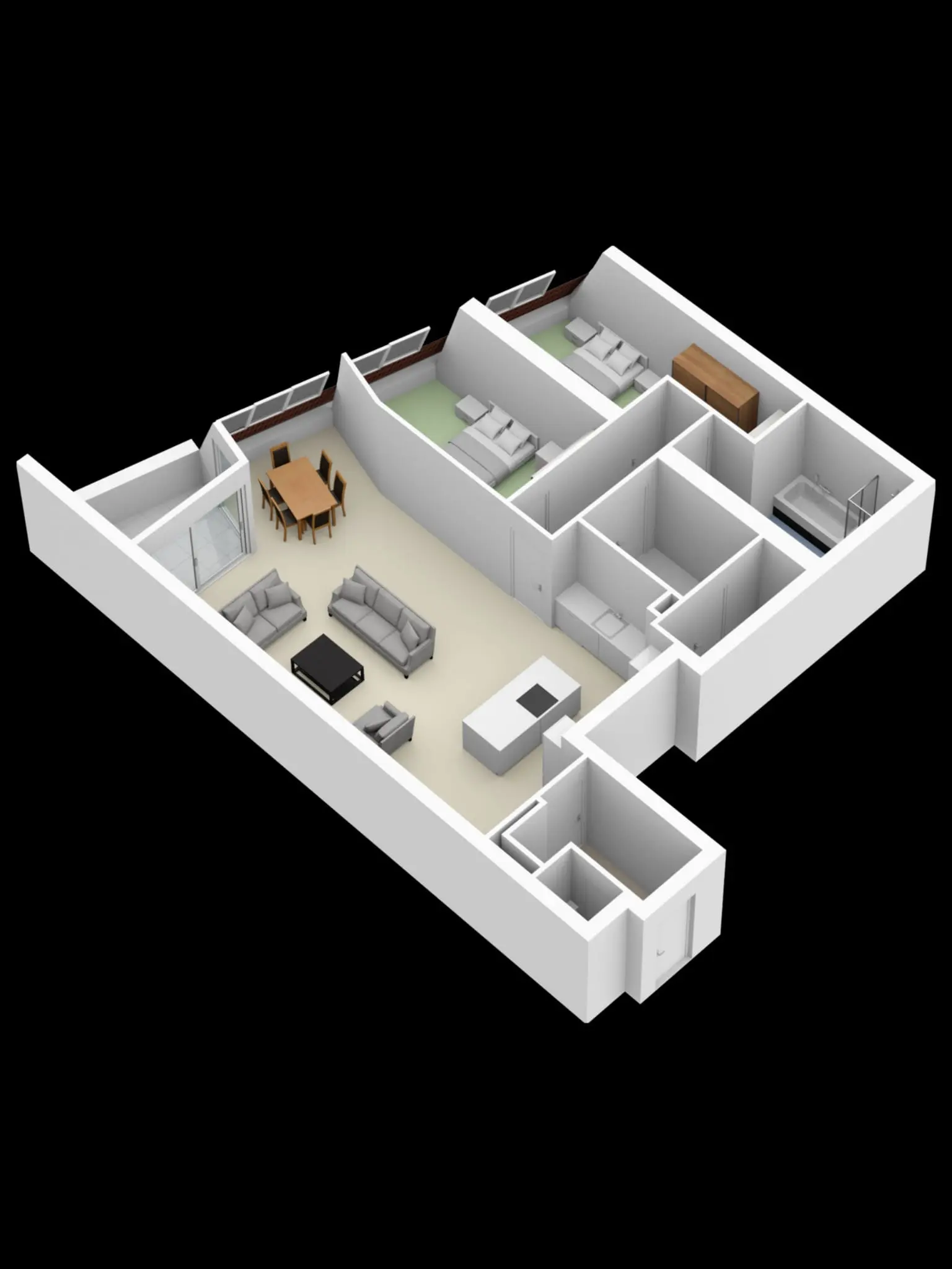 The spacious living room has several possibilities for decorating due to the playful layout. The entire apartment has luxury PVC flooring.